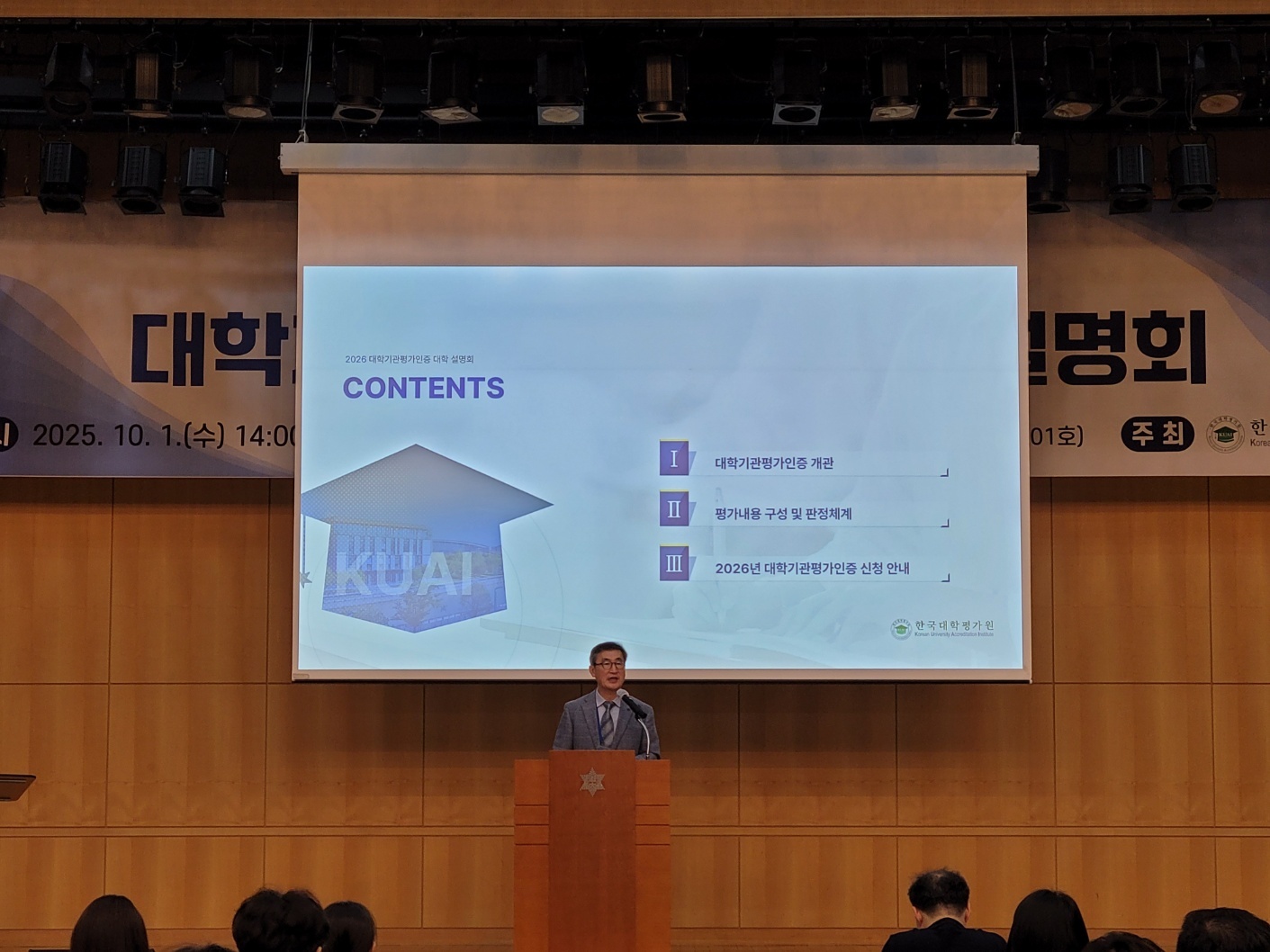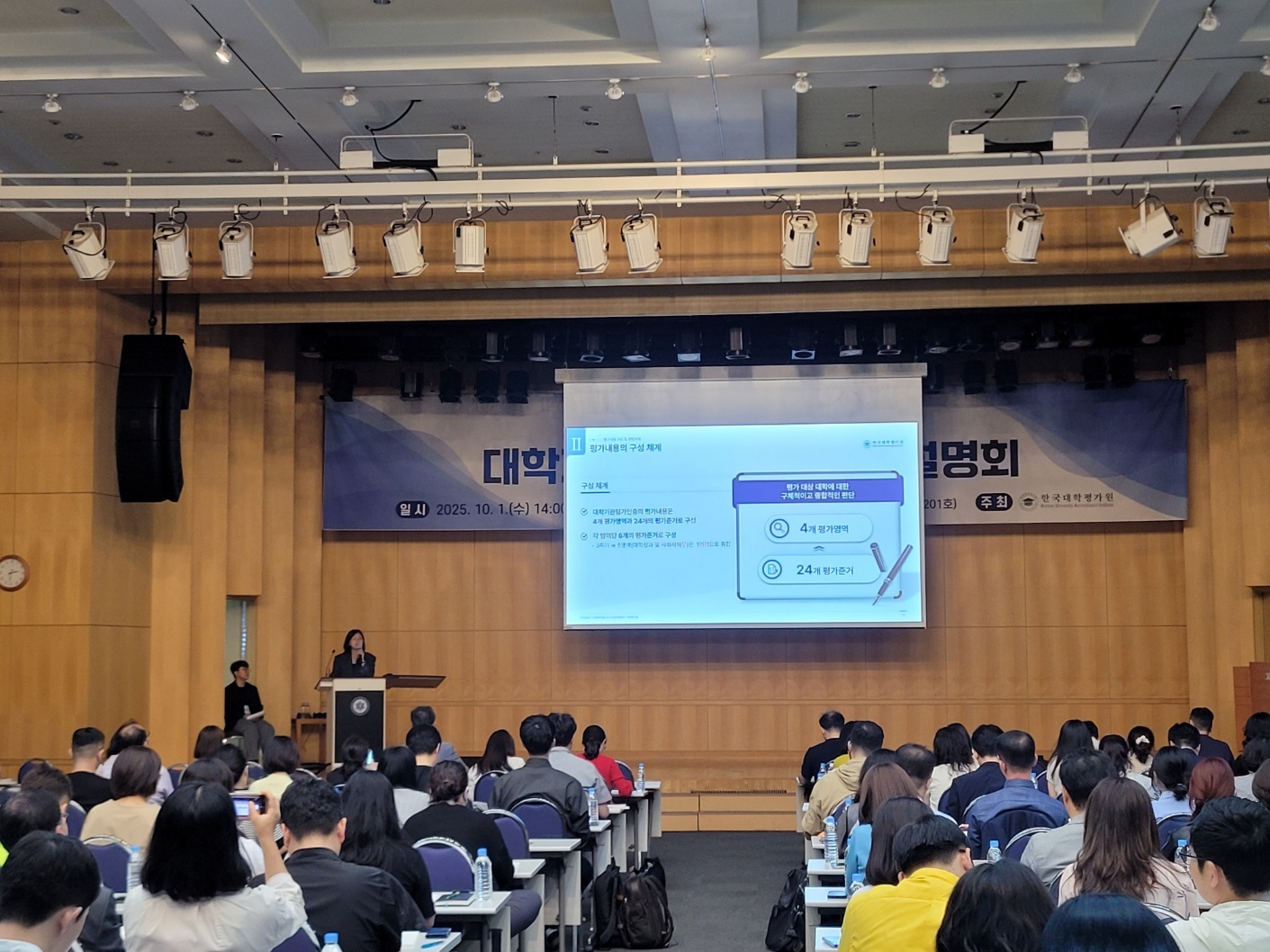 한국대학교육협의회 병설 한국대학평가원(원장 이석열, 이하 평가원)은 2025년 10월 1일(수), 숙명여자대학교 백주년기념관 201호에서 「2026년 대학기관평가인증 대학 설명회」를 개최하였다. 2026년 대학기관평가인증 본평가 대상 대학 외 전체 회원교의 대학 담당자 184명, 한국대학평가원 관계자 9명 등 총 193명이 참석하였다.