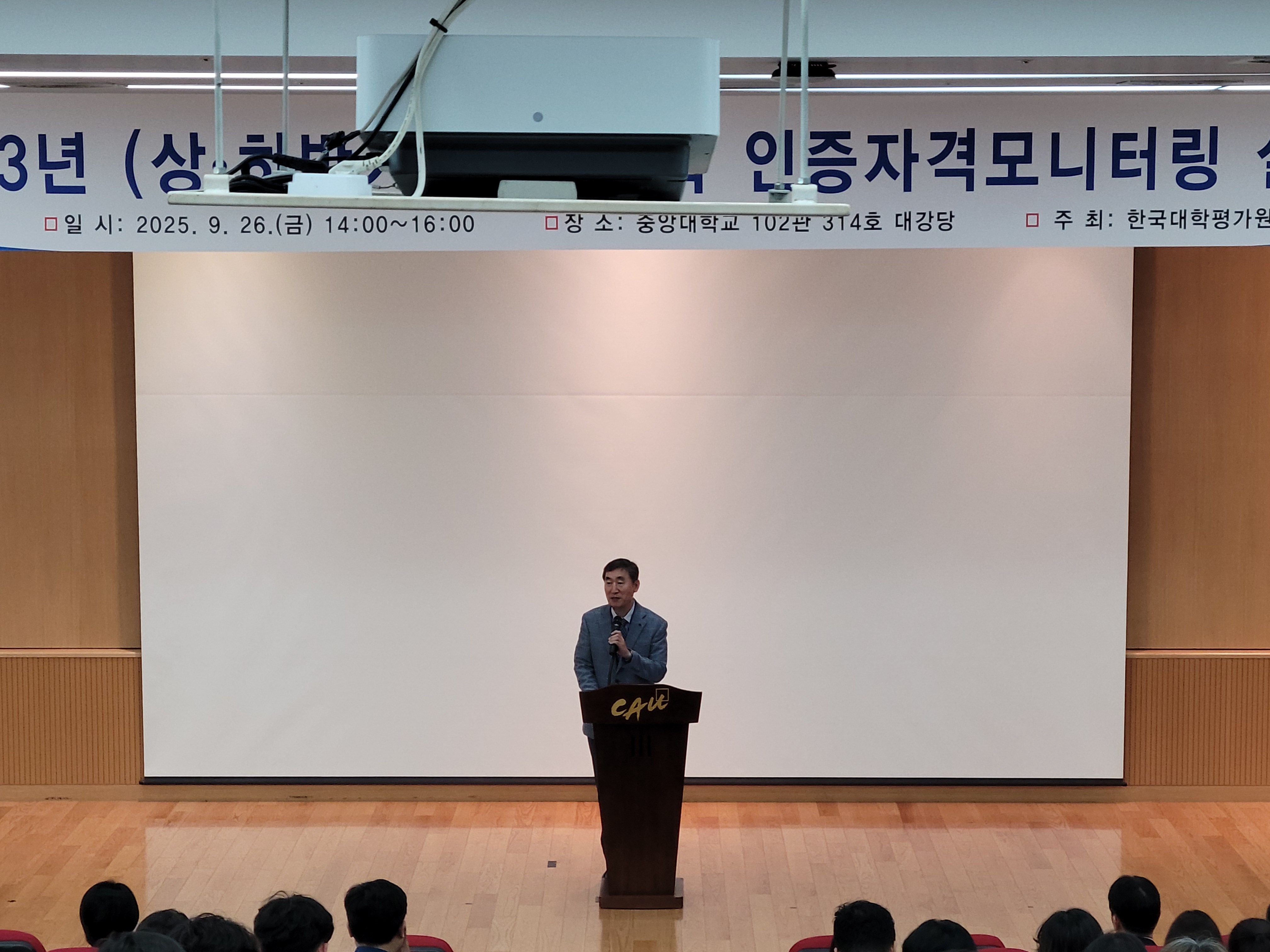 한국대학교육협의회 병설 한국대학평가원(원장 이석열, 이하 평가원)은 2025년 9월 26일(금), 중앙대학교 102관 314호 대강당에서「2023년(상·하반기) 인증대학 인증자격모니터링 설명회」를 개최하였다. 2023년(상반기) 인증대학 13개교의 대학기관평가인증 담당자31명, 2023년(하반기) 인증대학 54개교의 대학기관평가인증 담당자 113명, 한국대학평가원 관계자 9명 등 총 153명이 참석하였다.